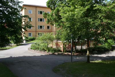 Här är Tvärvägen, en av vägarna som omger BRF Eken. Svänger du till vänster nere vid korsvägen är du på Allévägen och har bara ett par minuters gångväg ner till Centrum.